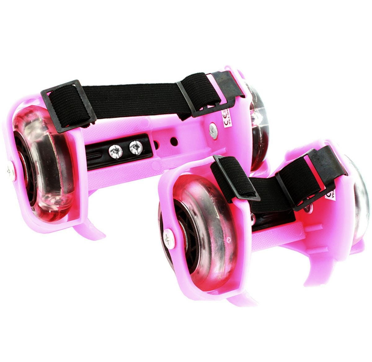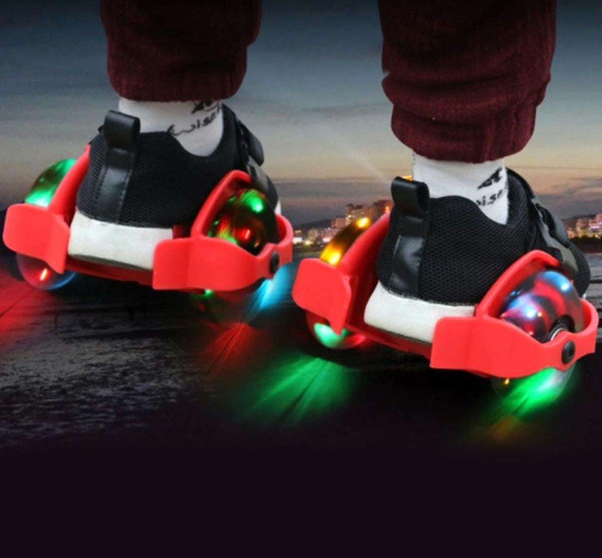 Święcące kółka / nakładki na obuwie. Umożliwiają szybką i wygodną zmianę Twoich standardowych butów w eleganckie rolki z podświetleniem LED! Nie wymagają dodatkowego zasilania! Wystarczy wprawić rolki w ruch aby zaczęły świecić wbudowane, kolorowe diody LED. Niezwykle łatwy i szybki montaż dzięki zastosowaniu elastycznej taśmy. Rolki można z powodzeniem dopasować do obuwia sportowego dowolnego rozmiaru! Nakładkę z rolkami wyposażono również w płynną regulację szerokości w płaszczyźnie od 6 do 9,5 cm co jeszcze bardziej zwiększa ich uniwersalność!