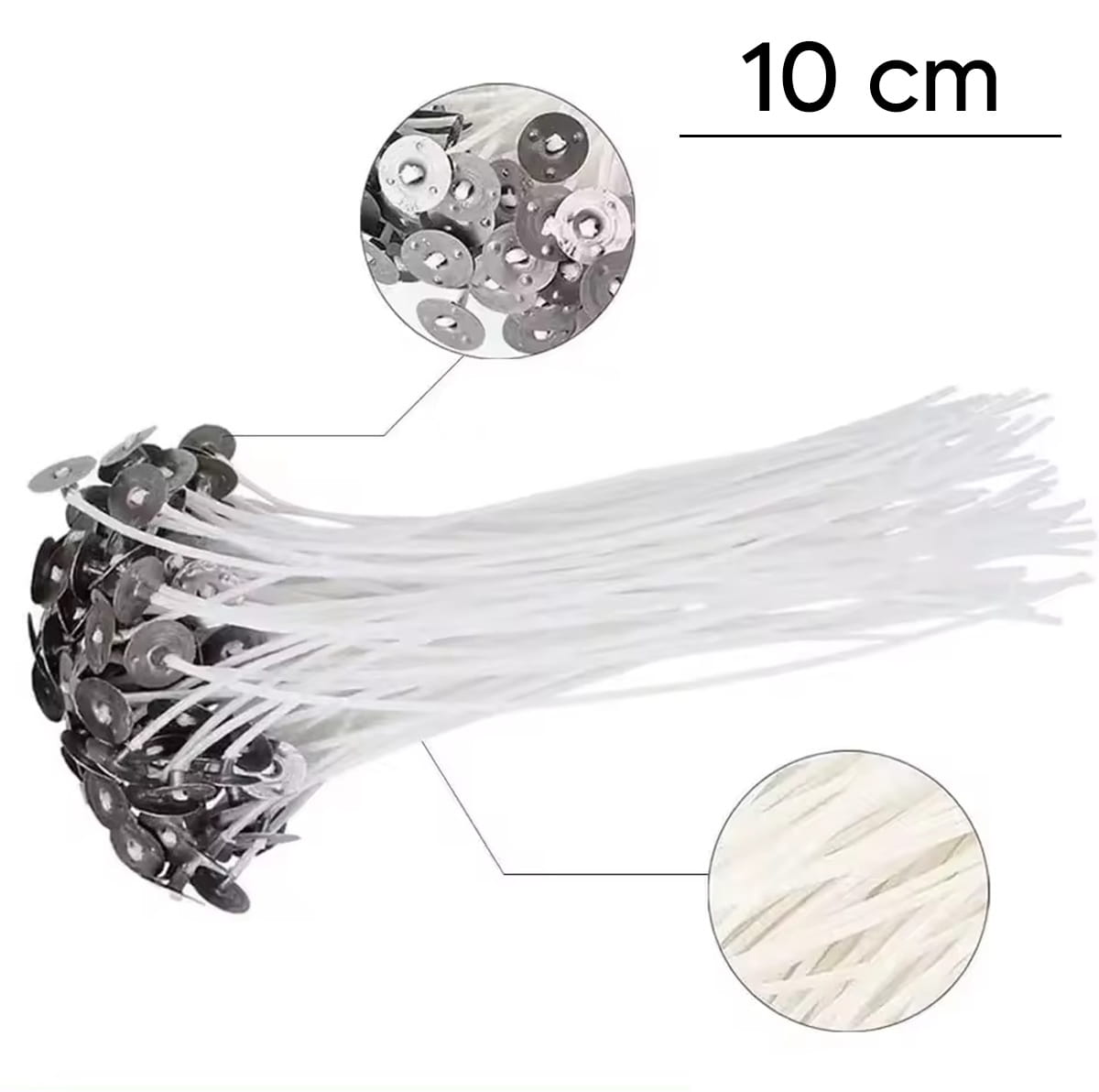 Zestaw 10 bawełnianych knotów do świec o długości 10 cm. Każdy z knotów został wykonany z zaimpregnowanych nitek bawełnianych. Knoty zostały zakute blaszką stabilizującą. Przeznaczone do świec o długości około 65-75 mm. Gotowe do natychmiastowego użycia.