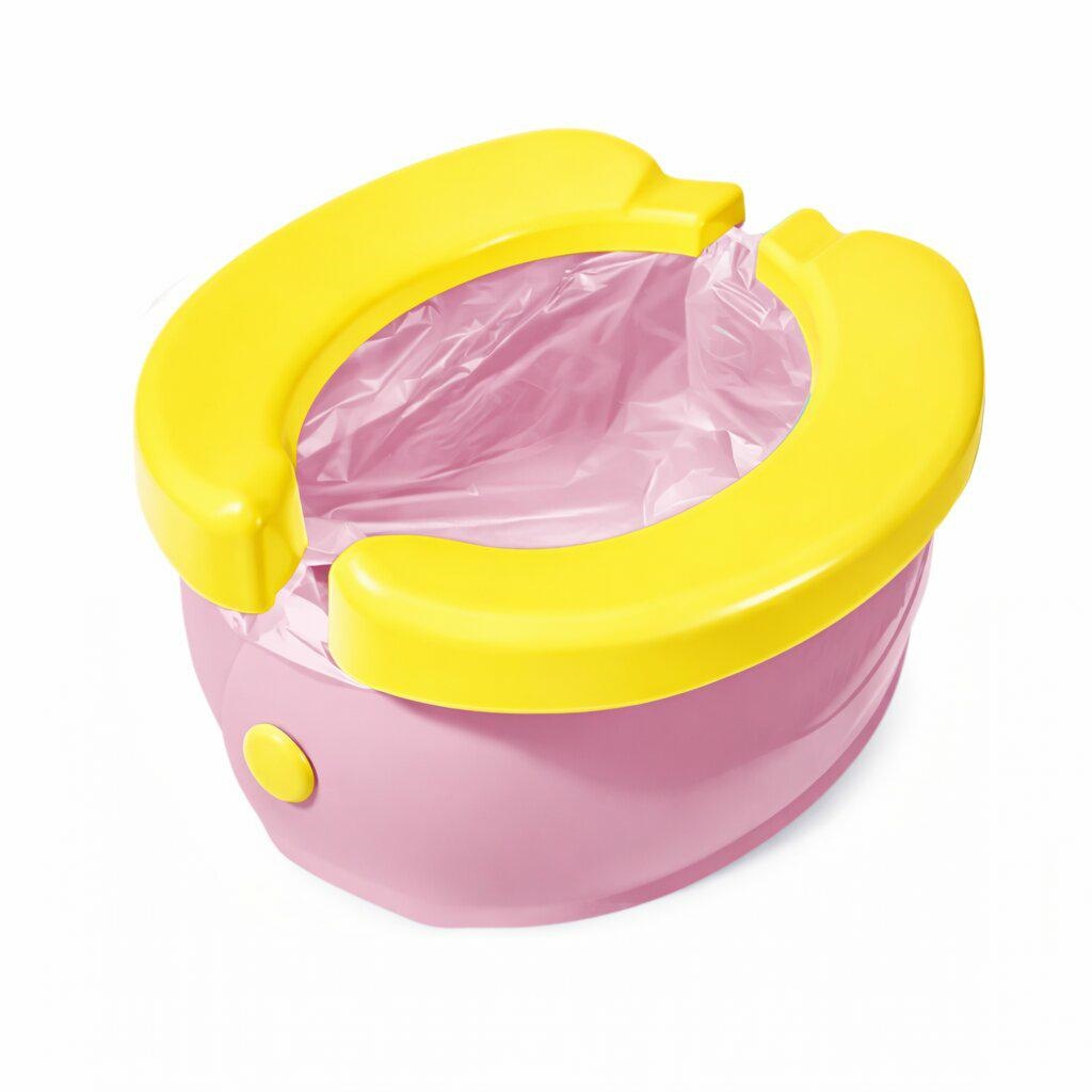 SKŁADANA TOALETA PODRÓŻNA DLA DZIECI – PRZENOŚNA, Z ETUI I WORKAMI, RÓŻOWO-ŻÓŁTA