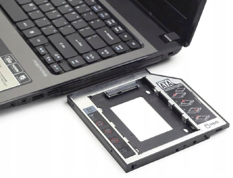 Aluminiowa kieszeń na dysk HDD 2,5 cala SATA montowana w standardowe miejsce montażowe stacji CD/DVD 9,5mm SATA w obudowie laptopa.