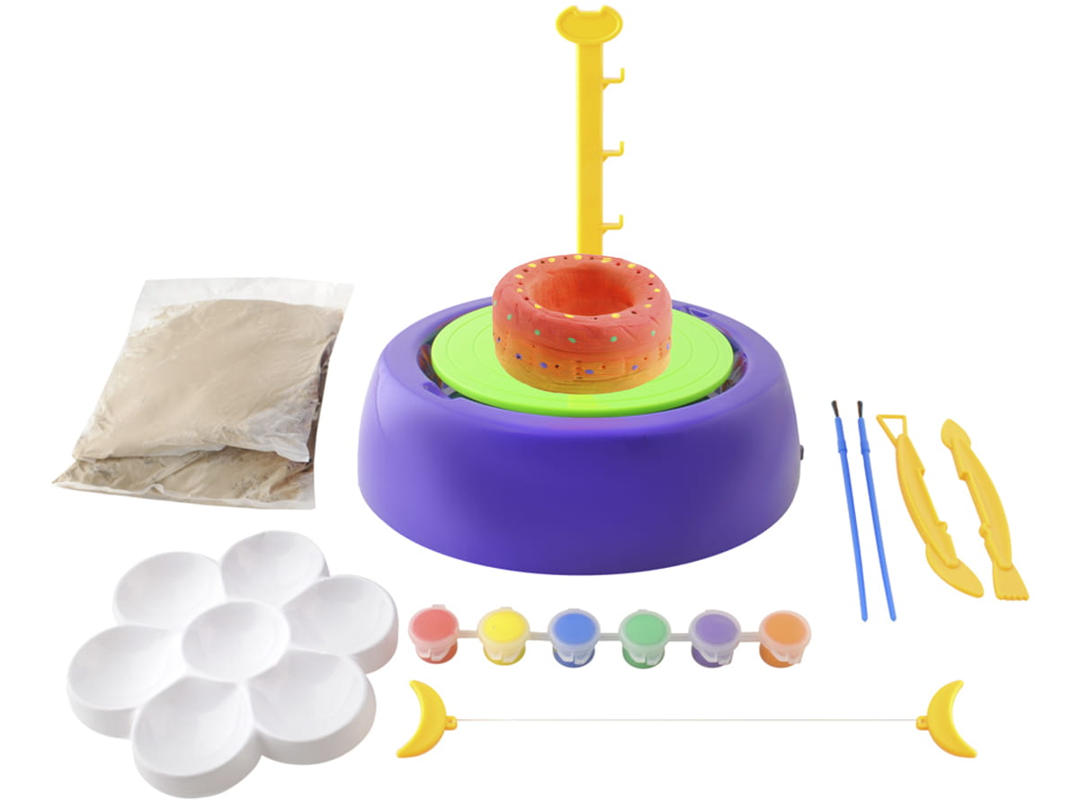 Zestaw rzeźbiarski z kołem garncarskim to świetna zabawka pozwalająca na tworzenie własnoręcznych dzbanków lub innych form z gliny. W zestawie znajdują się farbki i narzędzia, które pozwalają ozdobić naczynie według własnej fantazji. Zestaw rozwija zdolności artystyczne i manualne dziecka, pobudza kreatywne myślenie i poczucie estetyki. Koło garncarskie posiada przełącznik wyboru prędkości obrotu platformy (2 prędkości).