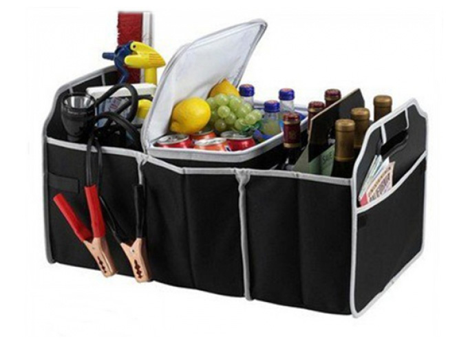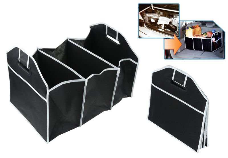 Wysokiej jakości składany organizer do bagażnika pomieści wszystkie przydatne drobiazgi, które trzymamy w samochodzie. Organizer ma wygodne i solidne plastikowe uchwyty. Składany, dzięki czemu zajmuje bardzo niewiele miejsca gdy nie jest potrzebny.