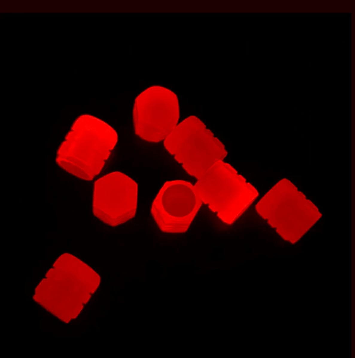 Zestaw dwóch fluorescencyjnych nakrętek na wentyle. Nakładki świecą w kolorze czerwonym, zapewniając atrakcyjny wygląd kół po zmroku. Kompatybilne z wentylami samochodowymi - nie pasują do kół rowerowych.