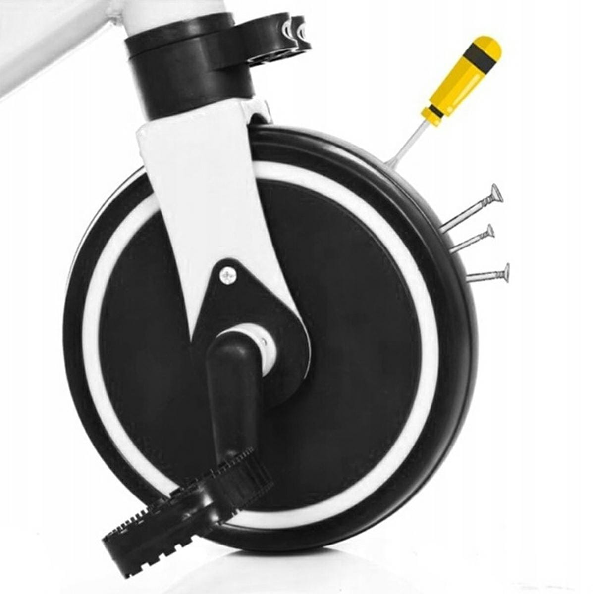 Solidna i uniwersalna konstrukcja, którą można łatwo dostosować do wieku i umiejętności dziecka. Możliwość złożenia tylnych kółek oraz złożenia i rozłożenia tylnych pedałów pozwala łatwo przekształcić rowerek w jeździk. Wygodne, miękkie siodełko posiada regulację wysokości, zaś kierownica została pokryta materiałem antypoślizgowym. Wszystkie koła posiadają warstwę z pianki EVA, która zapobiega rysowaniu powierzchni oraz lekko amortyzuje podczas jazdy. Możliwość błyskawicznego złożenia ramy ułatwia transport i przenoszenie rowerka.