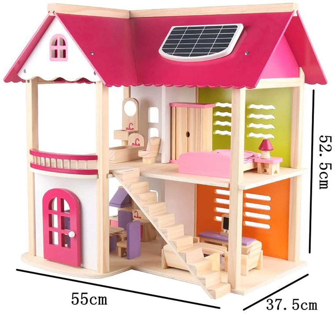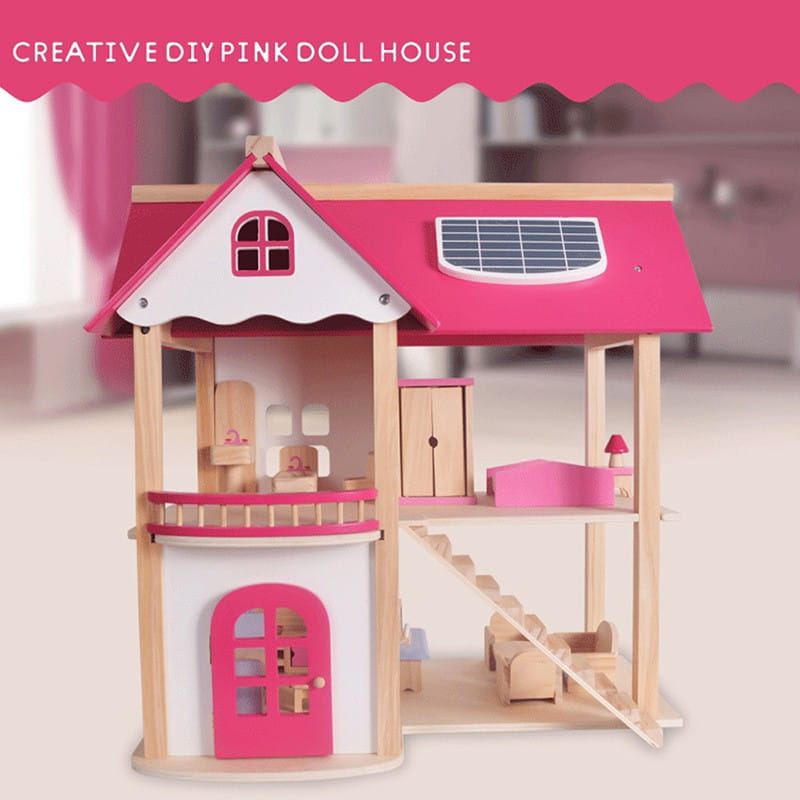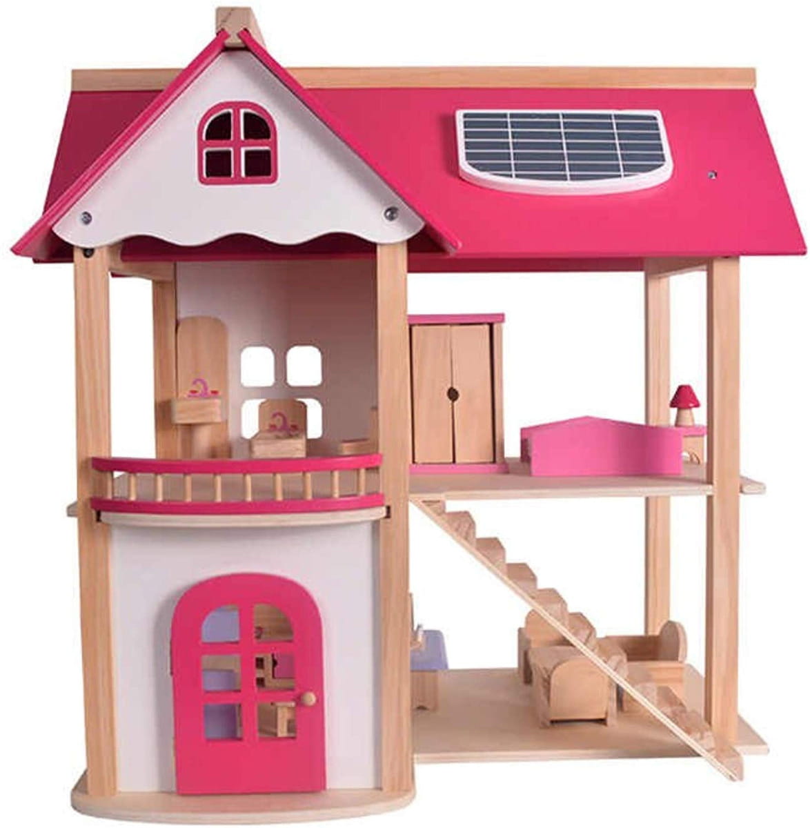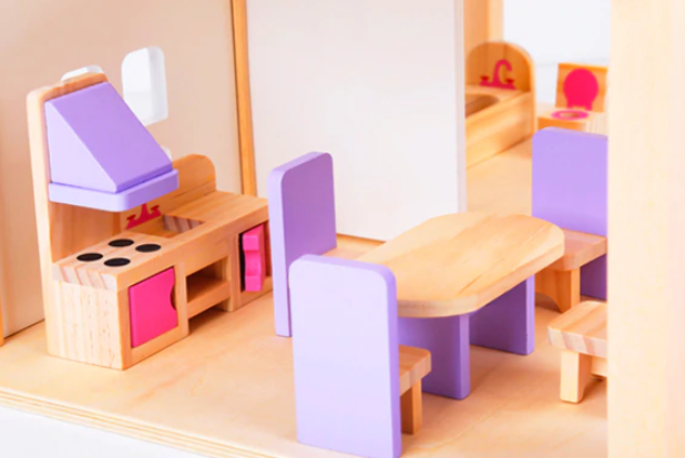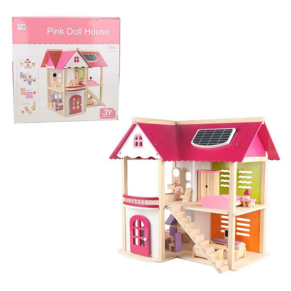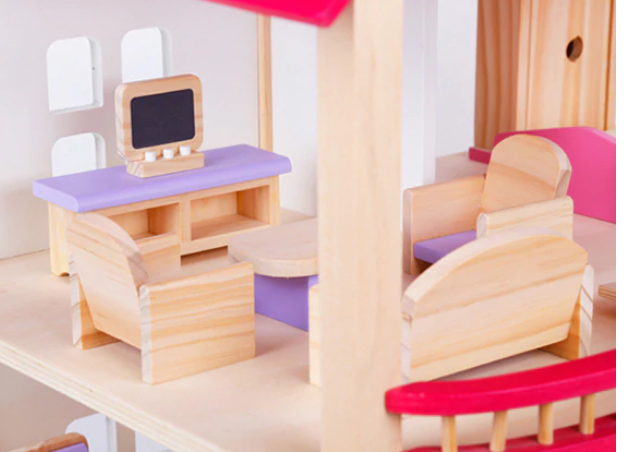 Drewniany domek dla lalek trzy piętra z tarasem, w pełni umeblowane kolorowe, różnorodne mebelki 4 niezależne pomieszczenia : łazienka, kuchnia, jadalnia, sypialnia meble, poręcze schodowe oraz dodatki wykonane ręcznie w pełni z litego drewna bezpieczne solidne wykonanie Domek dla lalek jest wykonany z najwyższej jakości naturalnego drewna. Posiada duże gabaryty i solidne wykończenie. Zestaw składa się z 2 kondygnacji połączonych schodami oraz taras i drzwi wyjściowe. Wnętrza idealnie odwzorowują prawdziwy dom. W środku znajdują się: łazienka, jadalnia, kuchnia i pokój na poddaszu z tarasem. Produkt posiada szeroki zestaw wyposażenia. Meble widoczne na fotografii znajdują się w komplecie. Każdy detal został wykonany z dbałością o najdrobniejsze szczegóły. Dzięki wysokiej jakości produktu i odwzorowaniu detali, domek jest świetną zabawką edukacyjną przeznaczoną na wielogodzinną zabawę. W zestawie 16 mebelków: 2 x stół + 4 krzeseł kanapa, 2x fotel i stoliczek kawowy duży regał kuchenny z otwieranymi szafkami toaletka z siedzonkiem wanna, umywalka oraz toaleta duże łóżko, szafę oraz stolik nocny