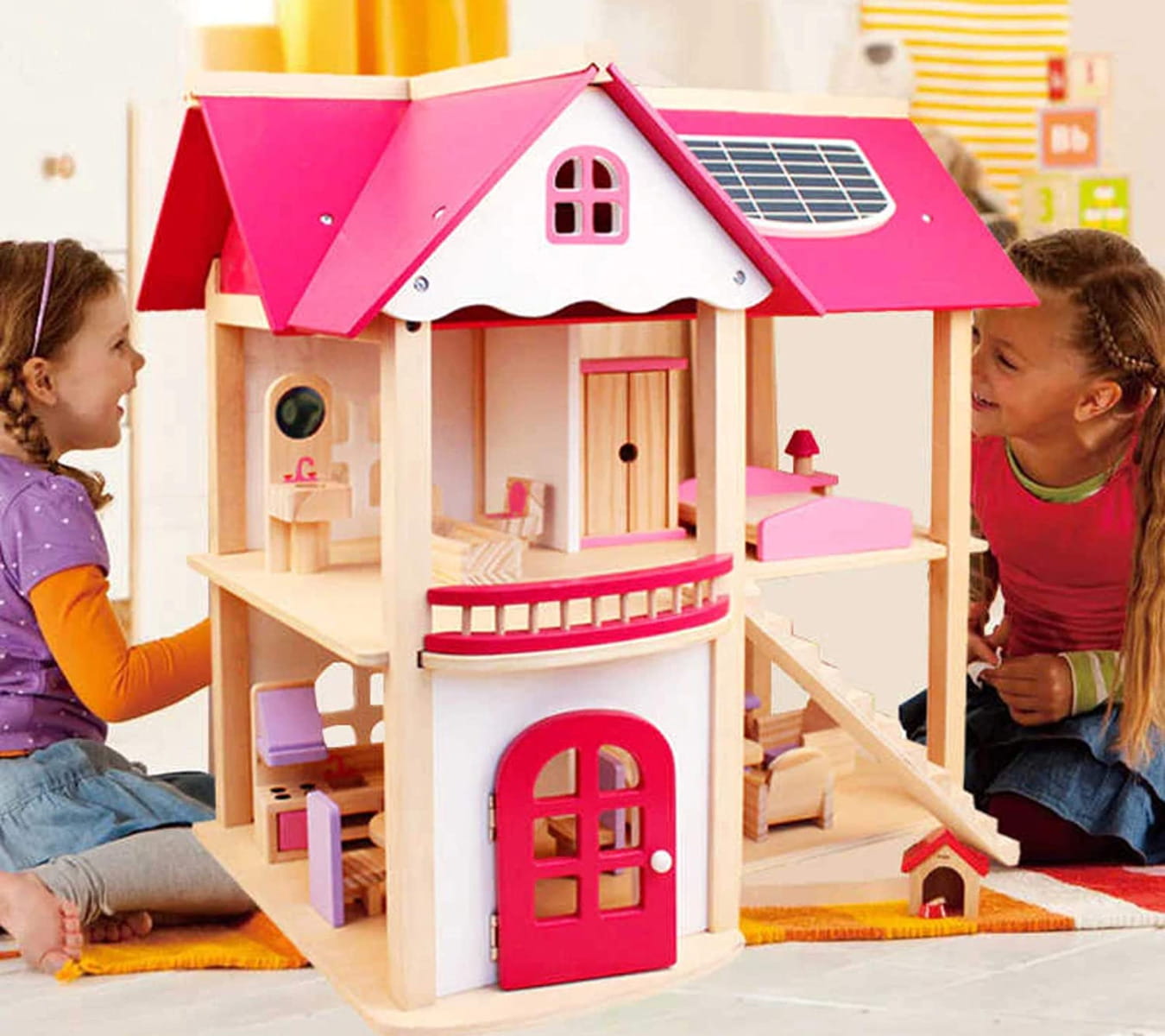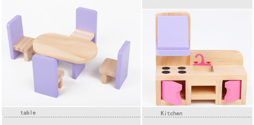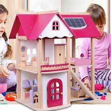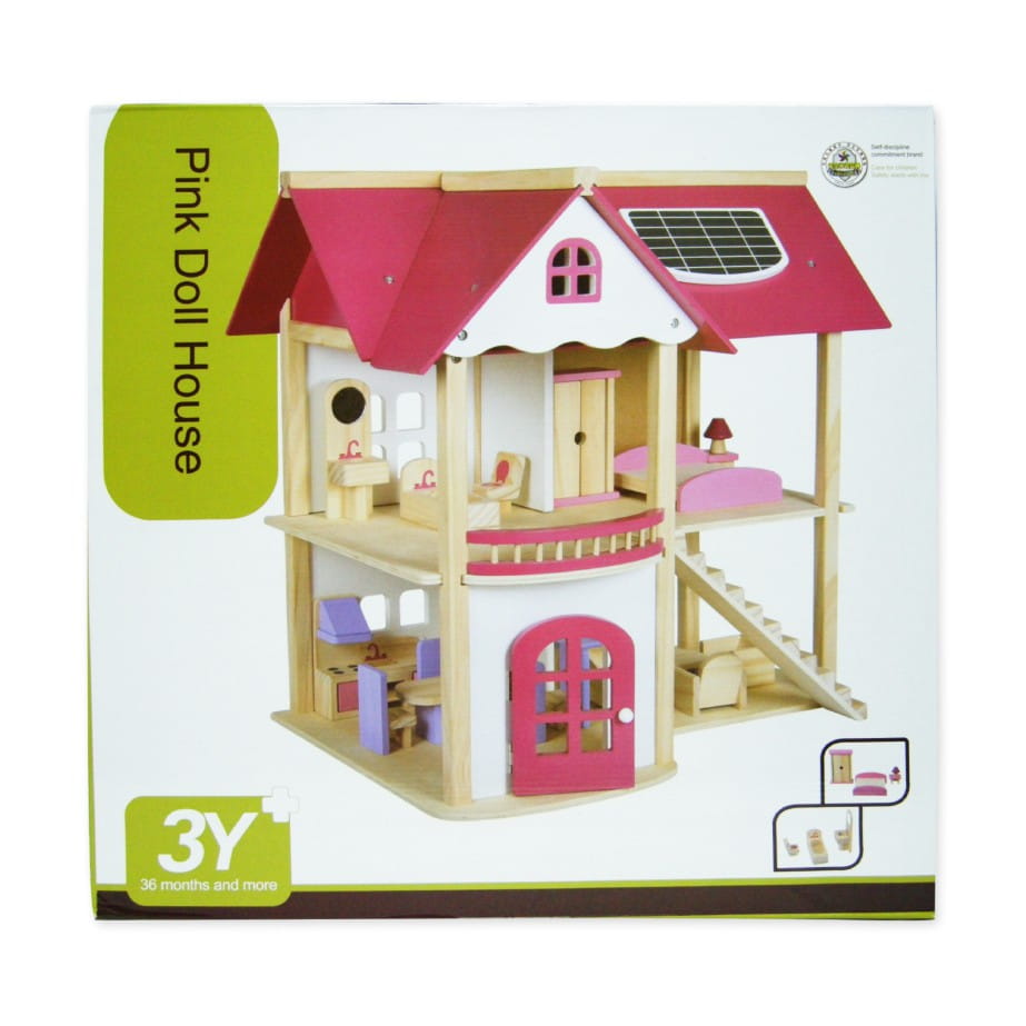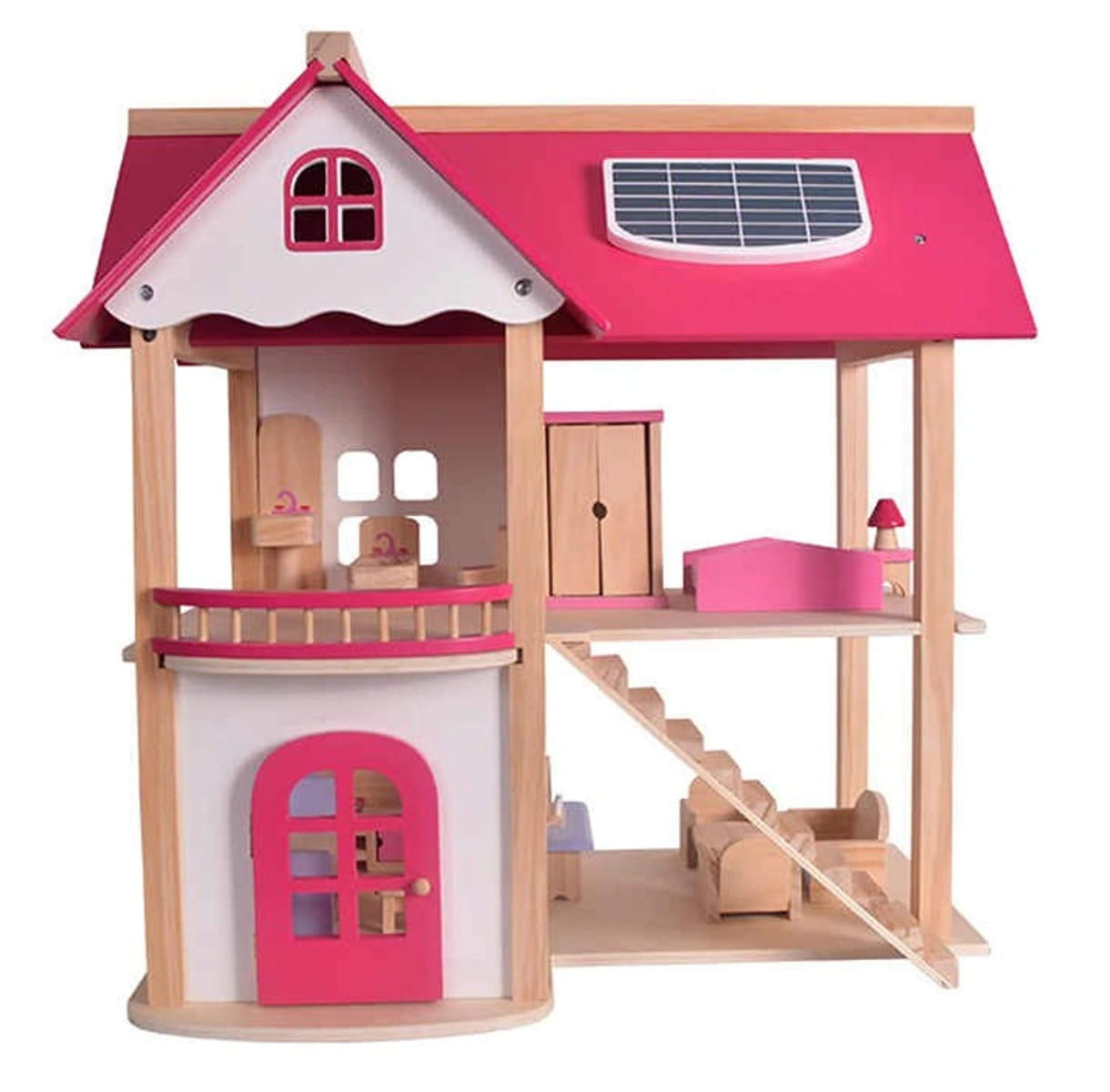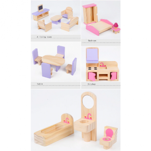 Drewniany domek dla lalek trzy piętra z tarasem, w pełni umeblowane kolorowe, różnorodne mebelki 4 niezależne pomieszczenia : łazienka, kuchnia, jadalnia, sypialnia meble, poręcze schodowe oraz dodatki wykonane ręcznie w pełni z litego drewna bezpieczne solidne wykonanie Domek dla lalek jest wykonany z najwyższej jakości naturalnego drewna. Posiada duże gabaryty i solidne wykończenie. Zestaw składa się z 2 kondygnacji połączonych schodami oraz taras i drzwi wyjściowe. Wnętrza idealnie odwzorowują prawdziwy dom. W środku znajdują się: łazienka, jadalnia, kuchnia i pokój na poddaszu z tarasem. Produkt posiada szeroki zestaw wyposażenia. Meble widoczne na fotografii znajdują się w komplecie. Każdy detal został wykonany z dbałością o najdrobniejsze szczegóły. Dzięki wysokiej jakości produktu i odwzorowaniu detali, domek jest świetną zabawką edukacyjną przeznaczoną na wielogodzinną zabawę. W zestawie 16 mebelków: 2 x stół + 4 krzeseł kanapa, 2x fotel i stoliczek kawowy duży regał kuchenny z otwieranymi szafkami toaletka z siedzonkiem wanna, umywalka oraz toaleta duże łóżko, szafę oraz stolik nocny