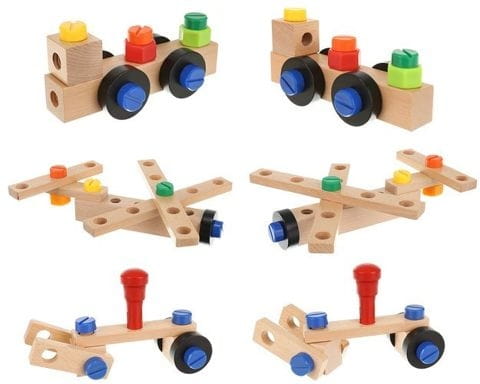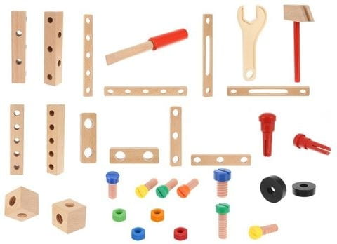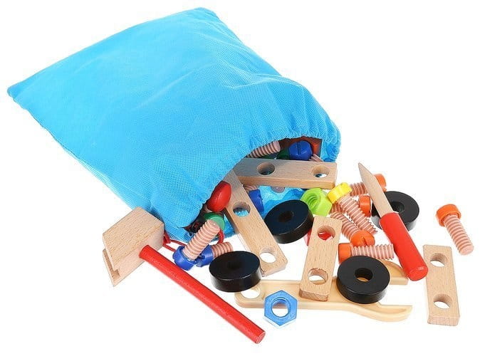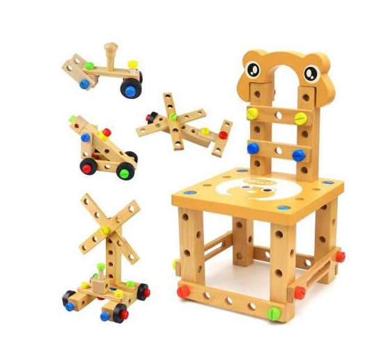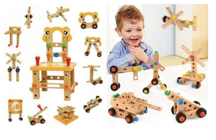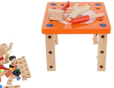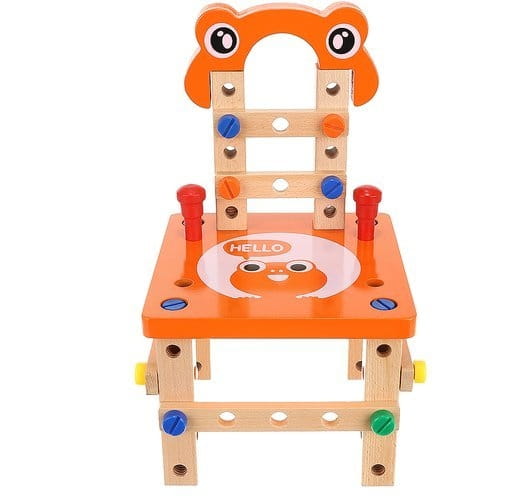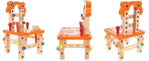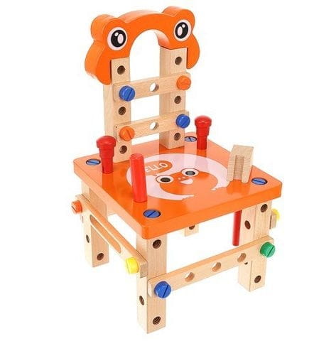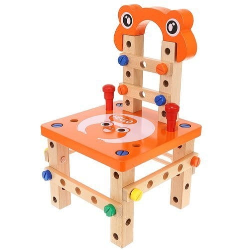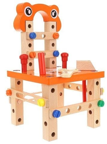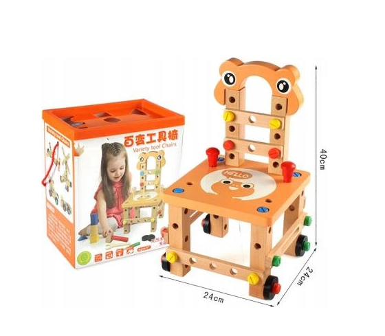 Krzesełko do skręcania zabawka Cechy produktu: kreatywny zestaw drewnianych elementów do samodzielnego złożenia do wykorzystania na wiele sposobów: można skręcić krzesełko, stoliczek, wiatrak, różnego rodzaju pojazdy (co tylko wyobraźnia podpowie) ćwiczy koordynację ruchowo- wzrokową uczy jak segregować, klasyfikować przedmioty rozwija funkcje logicznego myślenia rozwija umiejętności motoryczne oraz analityczne dziecka poprawi sprawność manualną każdego malucha dzięki dużej ilości możliwości rozwinie wyobraźnię przestrzenną oraz poćwiczy koncentrację idealny pomysł na prezent Specyfikacja: wymiar krzesełka: 21,5 x 21,5 x 37,5cm wymiar opakowania: 22 x 24 x 15 cm kolor: jak na zdjęciu Zestaw zawiera: podstawa siedziska - blat nakładka komplet kółek zestaw śrub o 3 długościach + 4 nakładki młotek klucz płaski klucz francuski listwy z otworami do mocowania kostki - łączenia worek ze ściągaczem Solidnie wykonana i kolorowa zabawka pobudzi ciekawość dziecka i wypełni czas świetną zabawą. Dopasowanie poszczególnych części i kolorów wzbudzi jego zainteresowanie, a sukces podczas składania zbuduje pewność siebie. Jeśli chcesz, aby Twoje dziecko rozwijało się prawidłowo, ta zabawka wspaniale łączy funkcje edukacyjne z zabawą. Dzięki tej zabawce będziecie mogli sprawić, że najmłodsi majsterkowicze wyćwiczą swoje ręce, umiejętności motoryczne i kreatywność. Z pomocą drewnianych narzędzi można złożyć z krzesła także inne zabawki, kształty i formy, co sprawia, że jest takie różnorodne.Dzieci mogą się bawić zarówno same, jak i w grupie, szczególnie to drugie jest bardzo polecane. Zestaw z pewnością zajmie twoją pociechę na kilka godzin, a ogromny wachlarz możliwości sprawi, że zabawka ta nigdy się nie znudzi. To bardzo interesujący pomysł na prezent.