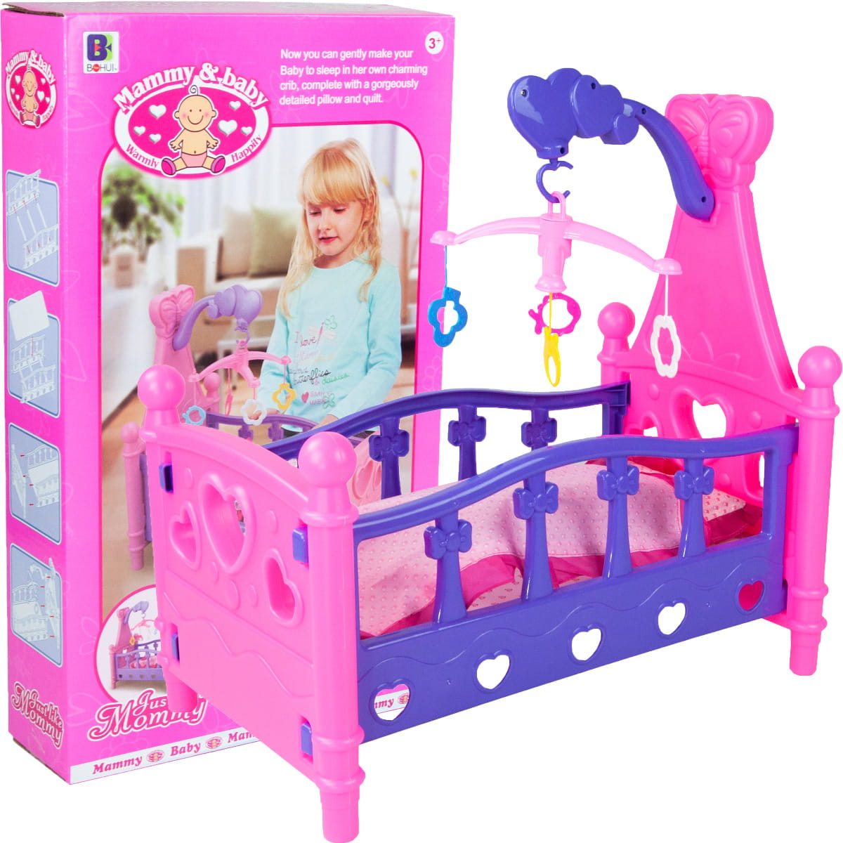 - Bogato wyposażone łóżeczko z kolorową karuzelą.