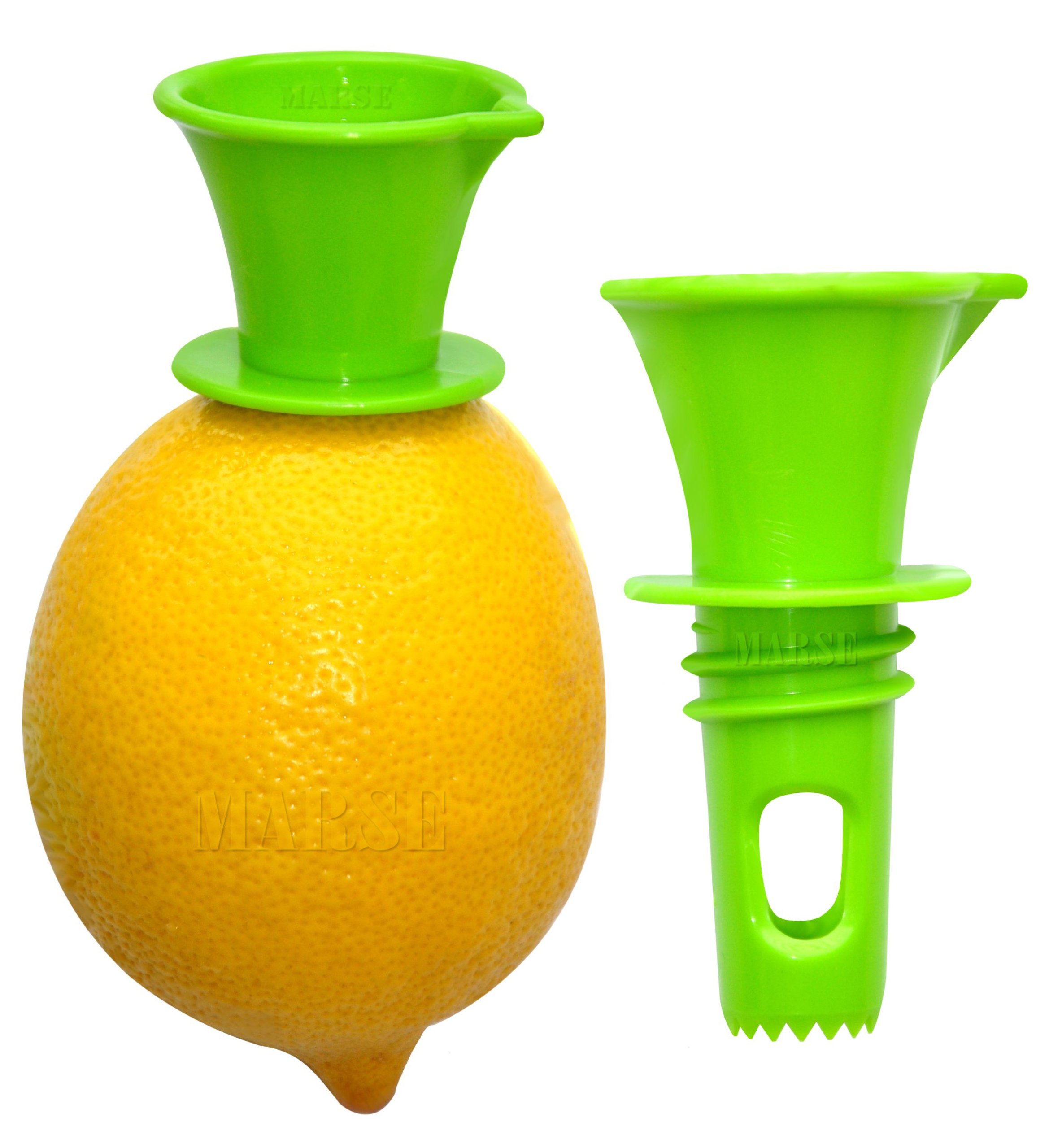 Wbijamy ostrą część wyciskacza np. w cytrynę, następnie wkręcamy ją na gwincie. Wygniatając cytrynę, cały z cytryny sok leci po lejku bez rozpryskiwania na boki jak w przypadku ręcznego wyciskania cytryny