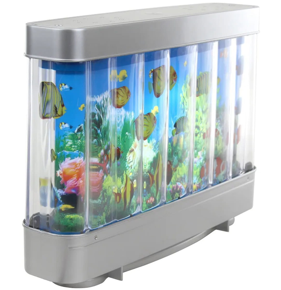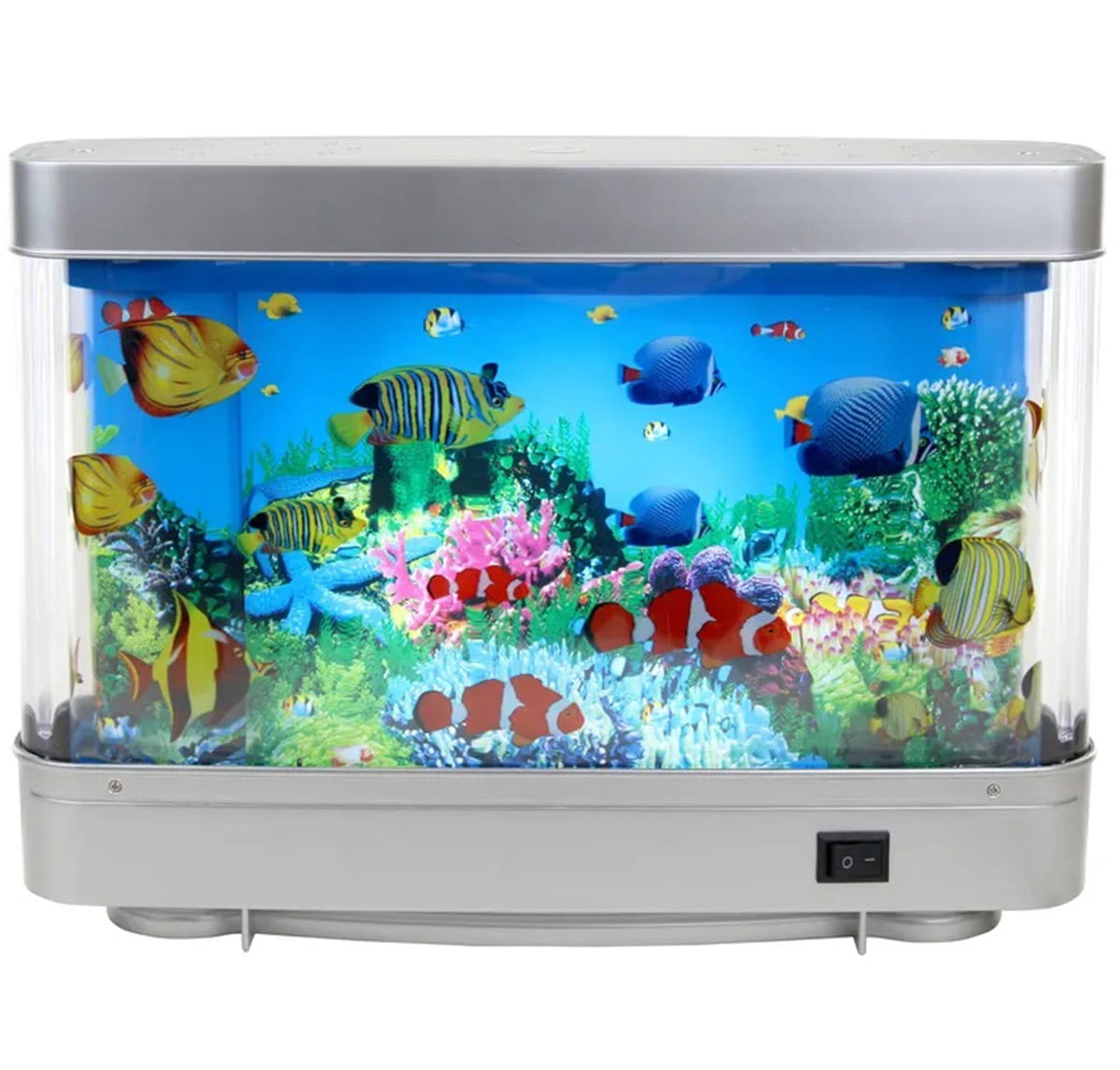 Dekoracyjna lampka nocna LED w kształcie sztucznego akwarium. Urządzenie świetnie imituje wygląd klasycznego akwarium za pomocą ruchomego tła z nadrukiem. Przeznaczona do postawienia na płaskiej powierzchni. Lampka wykorzystuje jasne podświetlenie LED o barwie neutralnej, białej. Zasilana bezpośrednio z sieci elektrycznej (nie wymaga ciągłej zmiany baterii). Wbudowany fizyczny włącznik/wyłącznik ON/OFF. Doskonale sprawdzi się jako oświetlenie relaksacyjne czy lampka nocna w pokoju dziecięcym.