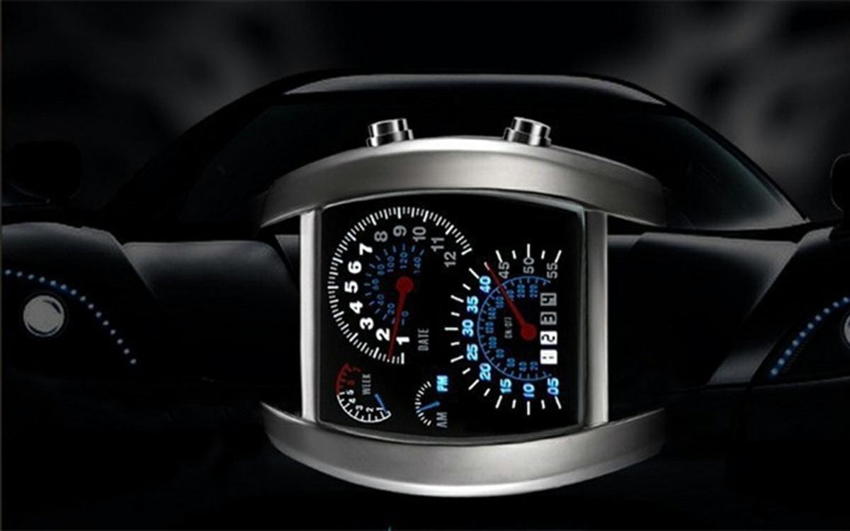 Absolutny HIT! Zegarek binarny zaciekawi innych i zrobi na nich niesamowite wrażenie! Wyświetla datę i czas wykorzystując do tego imitację samochodowych zegarów. Niebieskie podświetlenie doskonale kontrastuje z czarną tarczą zegarka. Dzięki zastosowaniu energooszczędnej technologii LED zegarek nie wymaga częstej zmiany baterii. Znakomity prezent dla każdego miłośnika dwóch i czterech kółek!