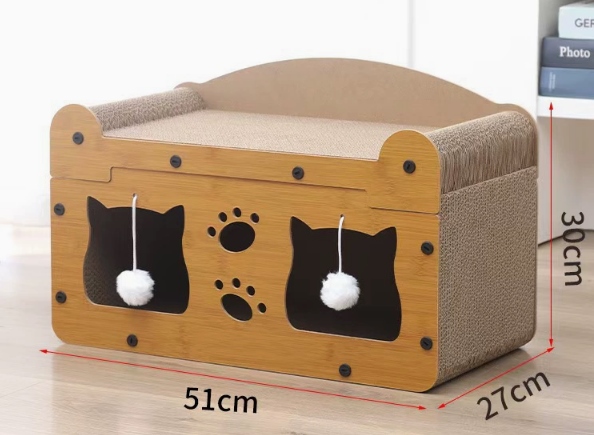 Domek oferuje kotu bezpieczną przestrzeń do odpoczynku oraz kryjówkę, w której pupil poczuje się swobodnie i bezpiecznie. Górna i boczne części wykonane z tekturowego drapaka wspierają naturalny instynkt drapania i pomagają w pielęgnacji pazurków. Dodatkową atrakcją są zawieszone kulki – zachęcające kota do aktywnej zabawy.